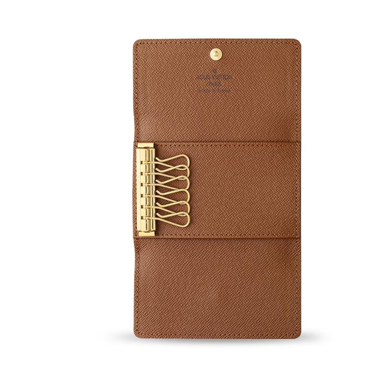 This compact case holds six keys on individual brass hooks. In Monogram canvas, it is a practical accessory for a handbag or briefcase.
