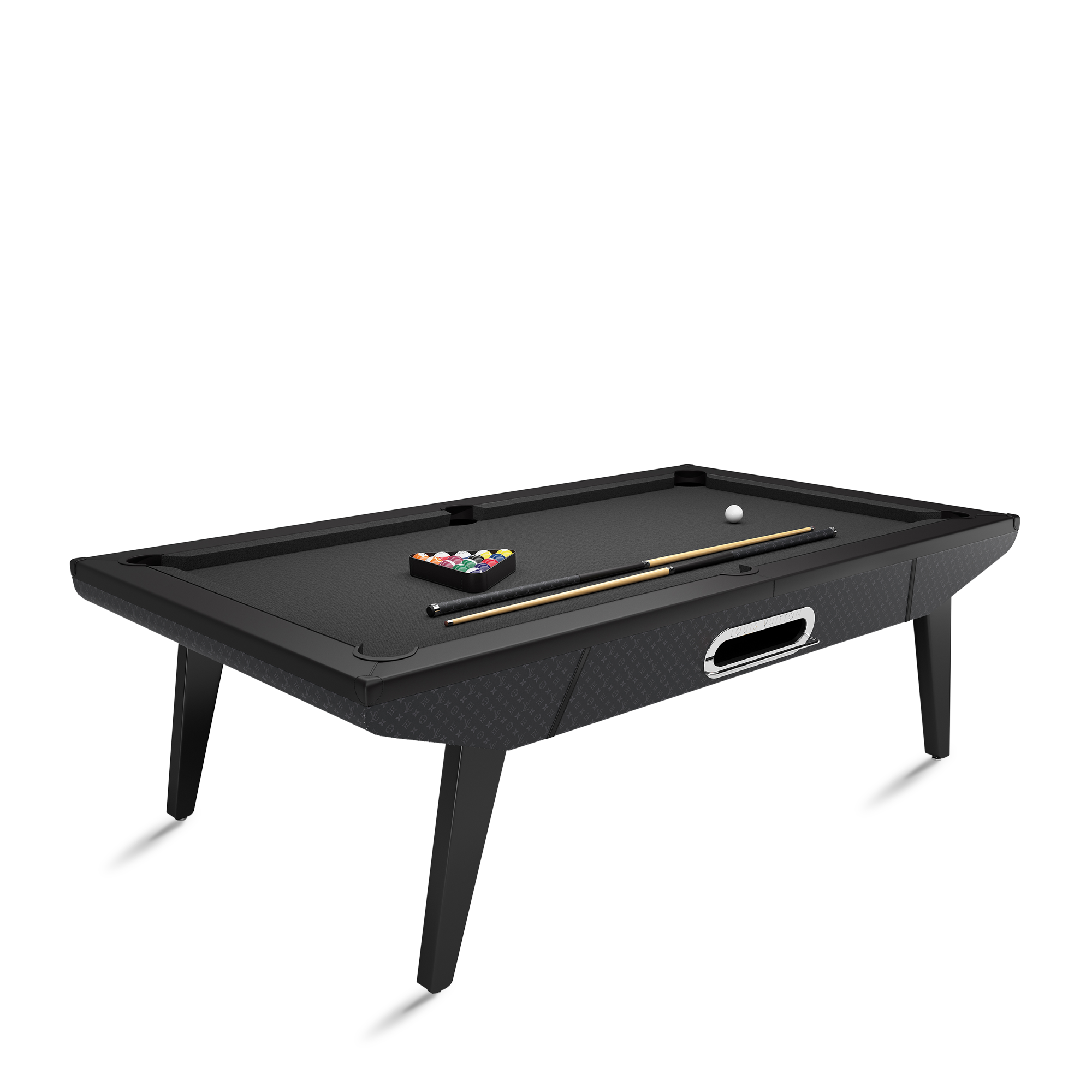 Modern aesthetics and heritage craftsmanship come together in this sleek, top-quality billiard table. Ideal for all billiards fans, this stunning piece features a wooden structure lined with the House's iconic Monogram Eclipse canvas. A solid slate bed ensures a perfectly flat playing surface. References to Louis Vuitton’s trunk-making history include the stitched suitcase-style corners, while the cue belts with engraved studs add a signature finishing touch.