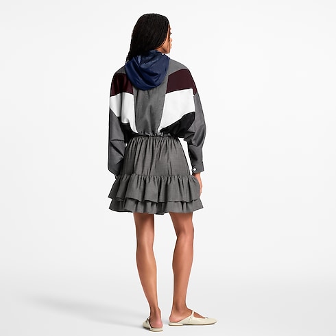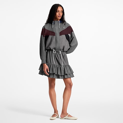 This windbreaker twists sporty and sophisticated codes in elegant tailoring wool detailed with graphic color-blocked inserts across the body, as well as a contrasting hood. It is crafted in a generous cropped fit with a drawstring waistline and a covered zipper fastening for an elevated finish. Complete with a sleek LV Twist signature.