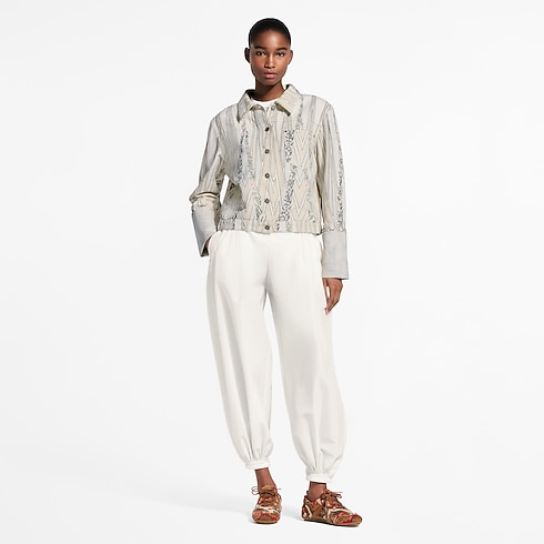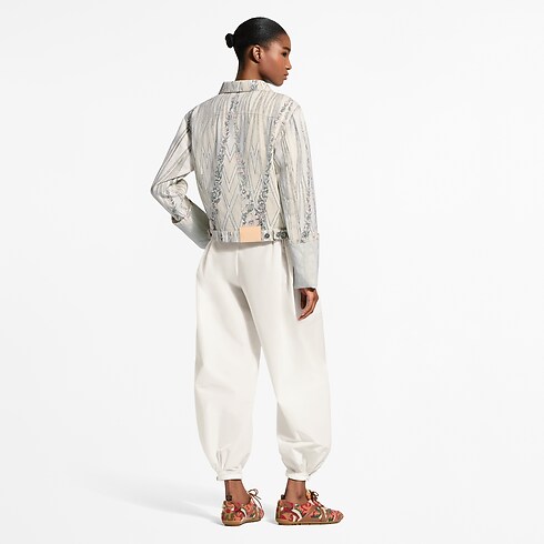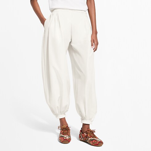 Drawing on the casual comfort of pajamas, these pants from the runway collection are crafted from breezy cotton poplin in a voluminous balloon shape, which is accentuated with pleat details at the hips and ankles. The waistband is fastened at the side with a button and discreetly signed with a tone-on-tone leather LV Circle tab.