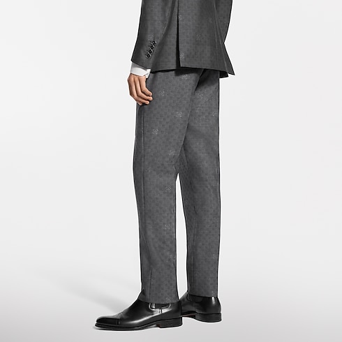 Elegantly tailored in a timeless dark gray, these flattering cigarette pants are ideal for formal business occasions. The fine wool is woven into a tone-on-tone jacquard with a sophisticated Mini Damier Seeds motif. The pattern incorporates Monogram Flowers with a softly dappled effect, while a woven LV label signs the rear waist. A matching jacket makes a poised and streamlined suit.
