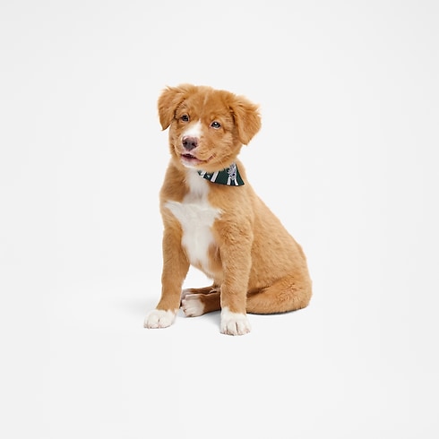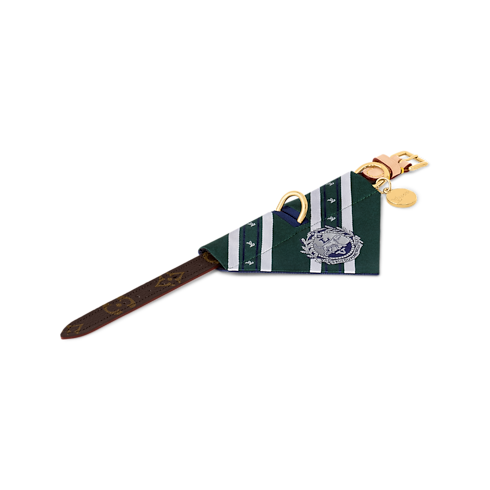 The first textile designed by Louis Vuitton for dogs, the Dog Bandana PM is inspired by the easy panache of men's ties. Green on one side, and navy on the other with the Monogram pattern in cream, the reversible silk bandana easily accessorizes the dog collar and is a perfect companion to the dog leash.