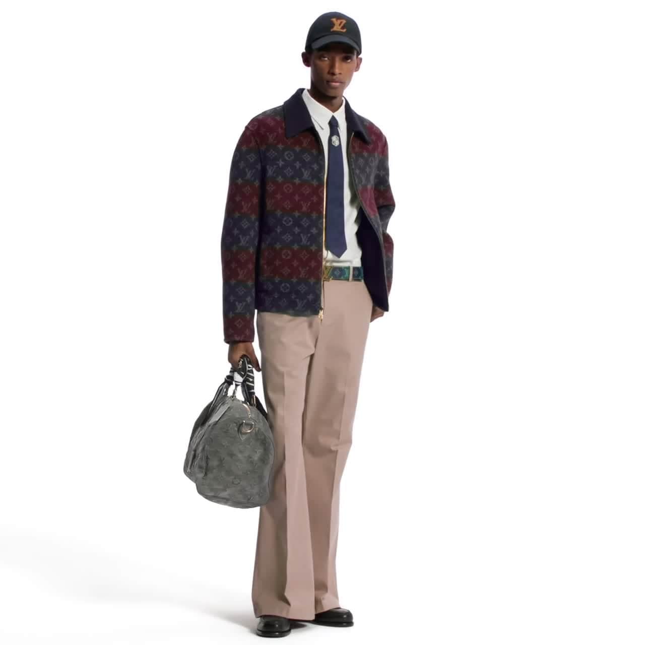 This reversible double-face workwear blouson is crafted in a luxurious wool, cashmere and silk blend. A timeless navy blue side is adorned with a metal LV ornament on the chest while a Monogram Heritage jacquard with sporty navy and burgundy stripes adorns the reverse. A perfect investment for autumn that can be styled for the office or the city.