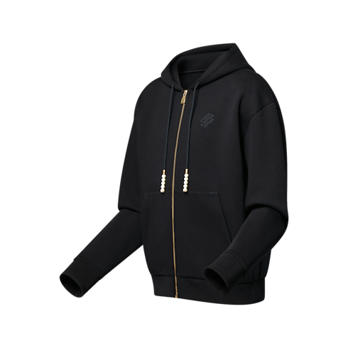 Perfect for travel, this zip-through hoodie with its distinguished details is a versatile layer for completing casual looks. Ornamental pearl beads on the cordon stoppers recall the dandy inspirations of this collection, while an embroidered Marque L. Vuitton Déposée signs the chest. Matching jogpants complete this casual zip-through.