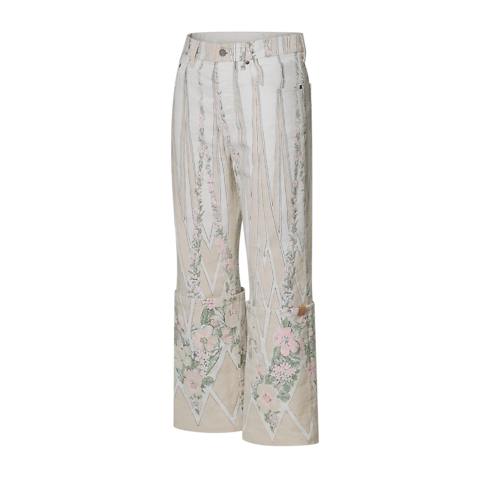 These pants make a chic statement in a graphic allover print inspired by classical wallpaper combining geometric and floral motifs in soft tones. They are cut from structured cotton-linen blend canvas in a straight shape finished with exaggerated XL cuffs for a modern play of proportion. A leather Louis Vuitton patch subtly signs the waistband.