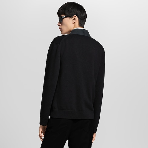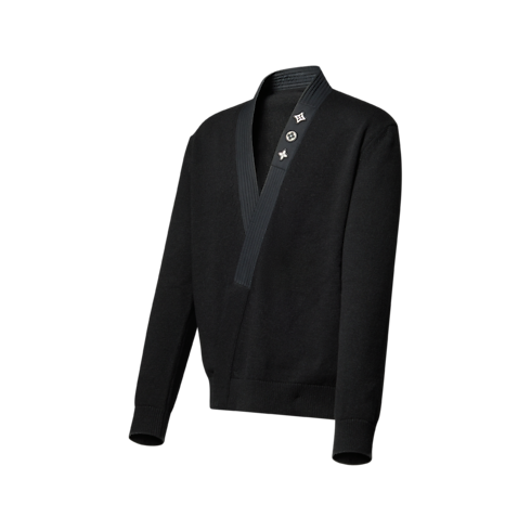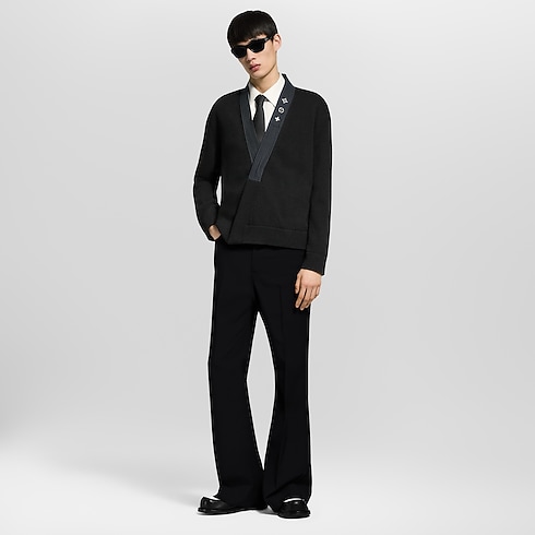 This black wool cardigan is from the Fall-Winter 2025 collaboration between Pharrell and Nigo. It features a lightly quilted cotton Kimono-style collar inspired by Nigo’s Japanese roots, which is embellished with three Monogram Flower patches with a delicate pearly luster. A concealed button fastening creates an elegant, pared-down silhouette that can be styled with casual and formal looks.