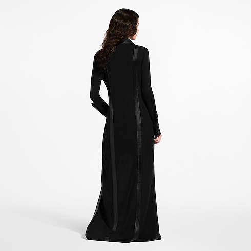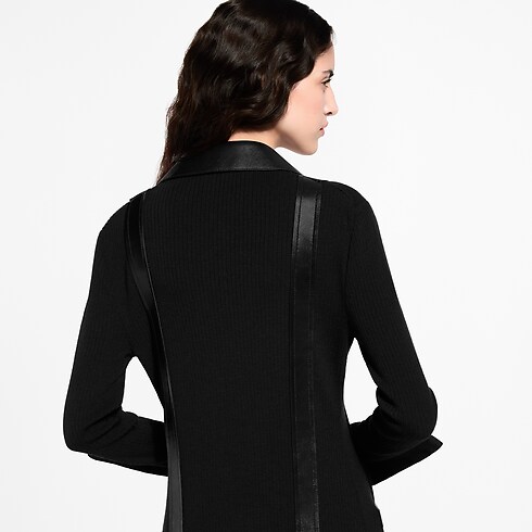 This cardigan from the runway is crafted in a full-length, fitted shape from a ribbed wool knit. Lambskin leather highlights the buttons, pointed collar, patch pockets, cuffs and graphic trims that run the length of the silhouette. A swivel snap hook adds a utility detail to the chest, while a Louis Vuitton Paris patch signs the hip.