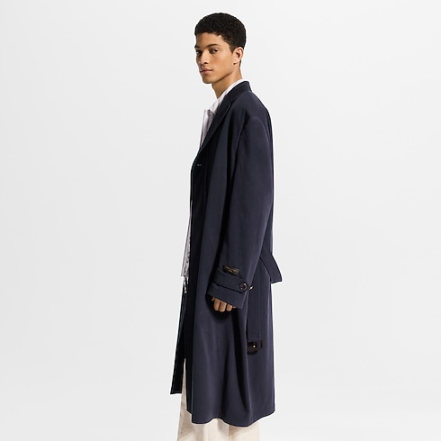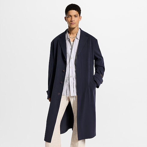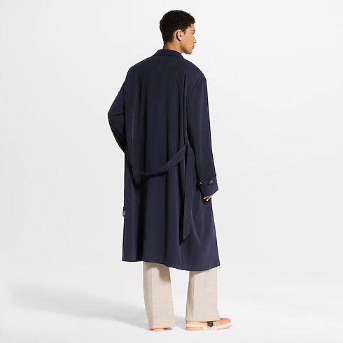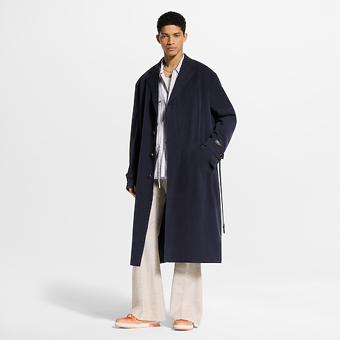 Tailored yet fluid, this lightweight belted coat embodies the effortless elegance of the Spring-Summer 2026 show’s Indian Dandy inspiration. The oversized silhouette it is cut from softly textured wool-silk fabric in a regal dark purple and half-lined with drop shoulders lending a soft structure. A signature patch crafted in leather adorns the left sleeve.