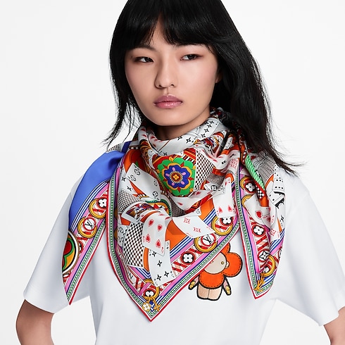 Styled in plush silk, the LV Card Game square expresses the carefree spirit of childhood and games. Its colorful print combines a castle of playing cards with evocations of travel: a Louis Vuitton trunk, hot air balloons, an antique automobile… Perfect for admirers of intricately designed silk squares, whether worn around the neck or displayed on a wall.