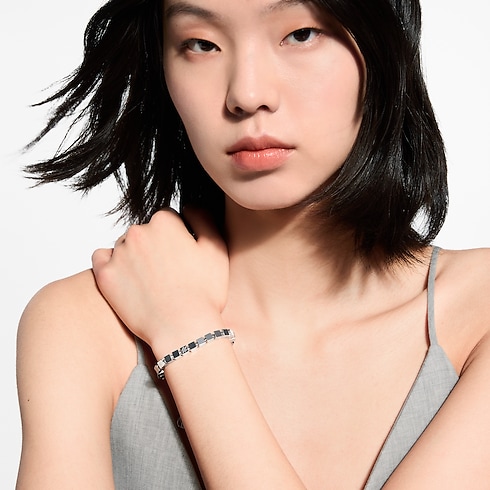 Crafted in sterling silver, the LV Cube bracelet was inspired by the classic Damier canvas and Pateki, a puzzle game devised by Gaston Vuitton in 1932. Its cube-shaped chain links are delicately engraved with canvas-like textures and the Louis Vuitton Paris signature for an original House touch. This distinctive bracelet enhances any outfit with an aura of playful elegance.