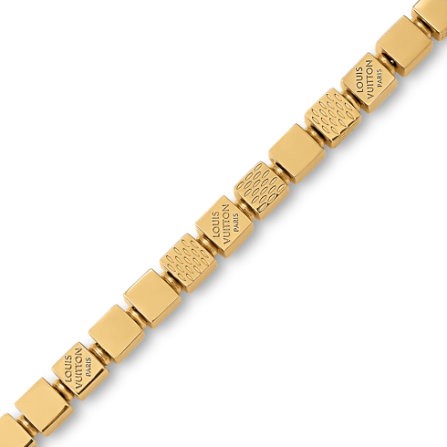 Finely crafted in gold-colored metal, the LV Cube bracelet was inspired by the heritage Damier pattern and a puzzle game called Pateki, designed by Gaston Vuitton in 1932. Its delicately linked cubes are engraved with Damier canvas-style stripes and the Louis Vuitton Paris signature for an extra House touch. Perfect for adding a glint of playful elegance to any look.