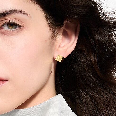 The strikingly original design of the LV Cube earrings was inspired by Pateki, a puzzle game devised by Gaston Vuitton in 1932. Cubes of lustrous gold-colored metal are adorned with engraving that evokes the House’s iconic Damier canvas, complete with the Louis Vuitton Paris signature. These fun, eye-catching earrings add a touch of playful elegance to any look.