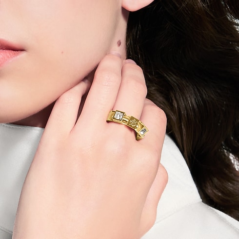 The eye-catching angular forms of the LV Cube ring were inspired by Pateki, a puzzle game invented by Gaston Vuitton in 1932. Its gold-colored metal band holds an array of cubes reminiscent of the historic Damier canvas, engraved with delicate stripes and the Louis Vuitton Paris signature. Resplendent rhinestones add a glamorous touch of sparkle to this enchanting ring.