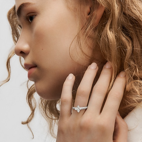 The Maison’s jewelry savoir-faire is on full display in this LV Diamonds Pavé Solitaire ring. An inspired creation, conceived to kindle powerful, intimate emotions, the ring is cast from 950 platinum, richly paved with brilliants and centered with an extraordinary LV Monogram Star cut diamond. With its 53 facets and pointed tips, the stone sparkles with unmatched radiance, evoking the starry monogram flower, a House icon designed by Georges Vuitton in 1896. The center stone is set into a pavé monogram flower bezel with a delicate flower shaped open work below the diamond which allows light to flow effortlessly and enhances the center stone's radiance. This piece is accompanied by an LV Diamonds certificate, a unique and immutable digital record of the central diamond’s characteristics and its journey, from extraction to final setting. This secure Certificate is powered by Aura Blockchain Consortium technology. It may also be customized, if desired, with a unique engraved date, message or initials.