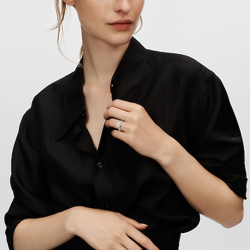 The Maison’s jewelry savoir-faire is on full display in this LV Diamonds Pavé Solitaire ring. An inspired creation, conceived to kindle powerful, intimate emotions, the ring is cast from 950 platinum, richly paved with brilliants and centered with an extraordinary LV Monogram Star Cut diamond. With its 53 facets and pointed tips, the stone sparkles with unmatched radiance, evoking the starry Monogram Flower, a House icon designed by Georges Vuitton in 1896. The center stone is set into a pavé Monogram Flower bezel with a delicate flower shaped open work below the diamond which allows light to flow effortlessly and enhances the center stone's radiance. This piece is accompanied by an LV Diamonds Certificate, a unique and immutable digital record of the central diamond’s characteristics and its journey, from extraction to final setting. This secure Certificate is powered by Aura Blockchain Consortium technology. It may also be customized, if desired, with a unique engraved date, message or initials.