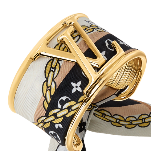 Combining the precious gleam of gold-toned metal with the plush feel of pure silk, the LV Initiales Silk bracelet takes jewelry design into a new realm of opulence and creativity. A removable silk Monogram bandeau is threaded through a finely crafted cuff adorned with a bold LV Initials emblem. A strikingly original bracelet with a unique signature look.