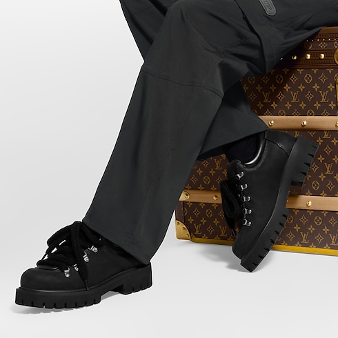The LV Remix derby draws inspiration from classic hiking boots, which it transforms into a distinctive, fashion-forward style. The upper comes in waterproofed nubuck leather and features multiple signature details, including Monogram Flower-engraved eyelets and a Monogram-canvas key bell referencing the House's leather goods. This model is finished with a robust rubber outsole.
