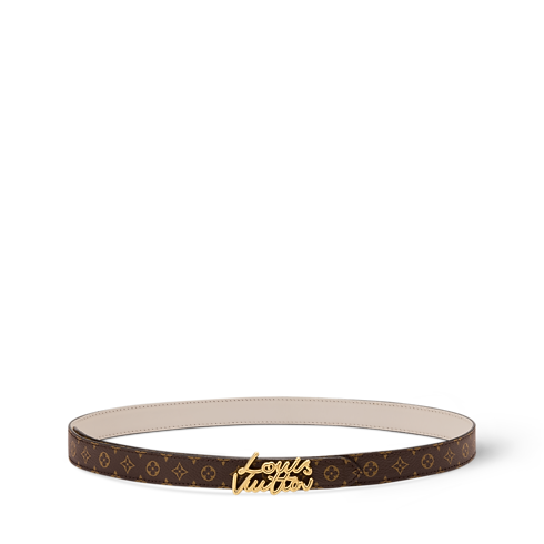 The reversible design of the LV Script belt offers a choice of sumptuous calfskin or the House’s iconic Monogram canvas. Its centerpiece is an outsized buckle crafted in gleaming gold-colored metal, spelling out the Louis Vuitton signature in a sleek hand-written style. Ideal for both casual and formal occasions, this versatile belt emanates sophistication and timeless elegance.