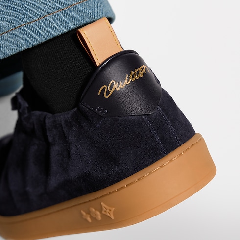 The LV Soft sneaker comes in supple suede calfskin with trim in the House's emblematic natural leather. In addition to laces, it features an elasticized heel for an easy, slip-on fit, and a sacchetto construction for lightness and comfort. It bears the LV Initials on the side and a Pharrell Williams-designed Vuitton signature at the back.