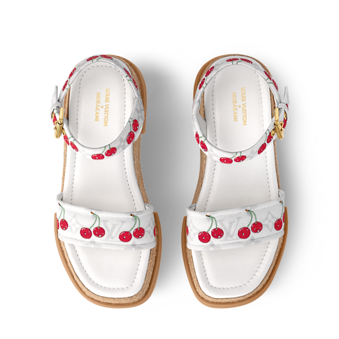 The Maya platform sandal is refreshed with spirited, summery codes from the re-edition of the coveted Louis Vuitton x Takashi Murakami collection. The straps catch the eye in Monogram coated canvas in a subtle shade layered with colorful cherry motifs in the Japanese artist’s signature kawaii style. A golden buckle adds a chic metallic accent, while the chunky platform is finished in braided rope for a breezy espadrille-inspired finish.