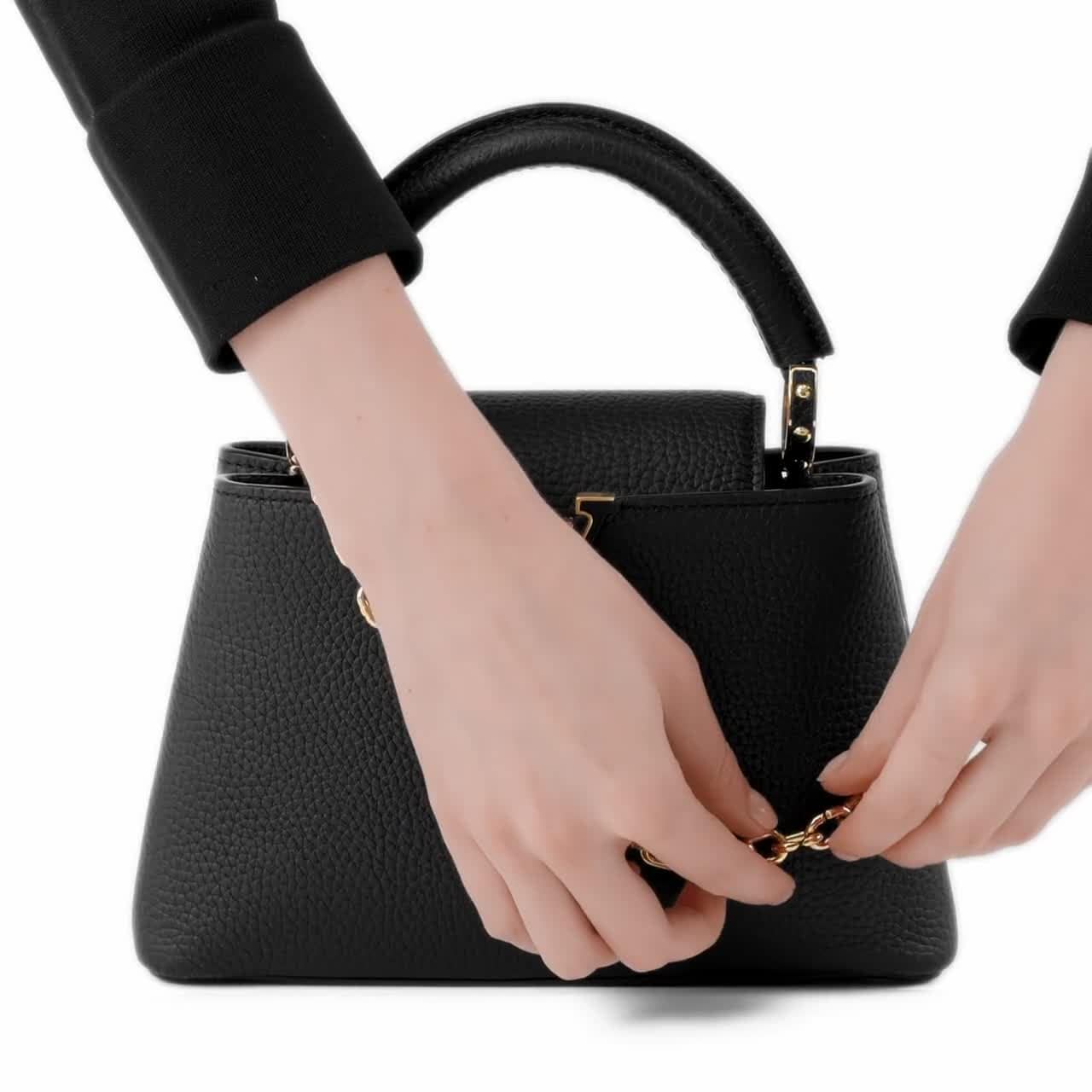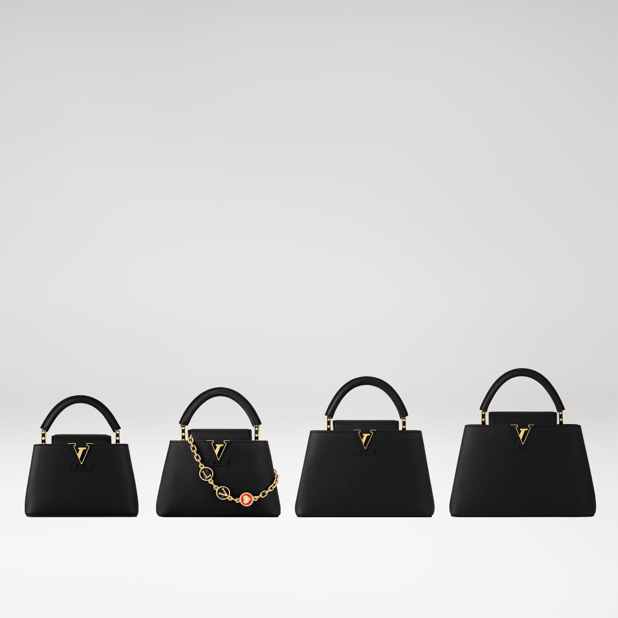 The iconic Capucines line welcomes this new personalized edition, in an exclusive small size in between the Mini and BB. Choose between 7 leather colors & customize a unique chain thanks to three unique charms, from bi-galvanized letters to crystals lucky charms featuring Louis Vuitton signatures. The bag is finished with sleek gold-toned hardware.