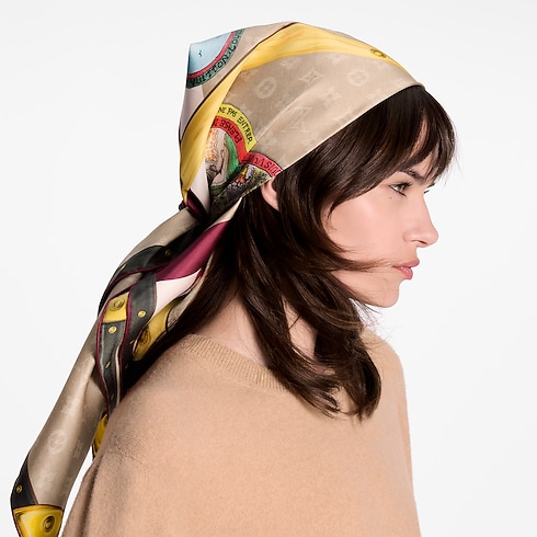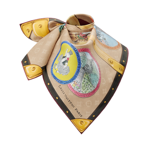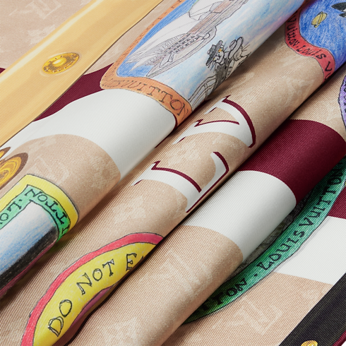 The fun and colorful My LV Trunk square was created as part of an exclusive collaboration with the fashion icon and illustrator Grace Coddington. Its artistic pattern depicts a vintage Monogram trunk adorned with eye-catching stickers featuring Grace’s whimsical illustrations of cats traveling the globe. A stylish travel companion, this versatile accessory elevates any look with a colorful burst of glamour.