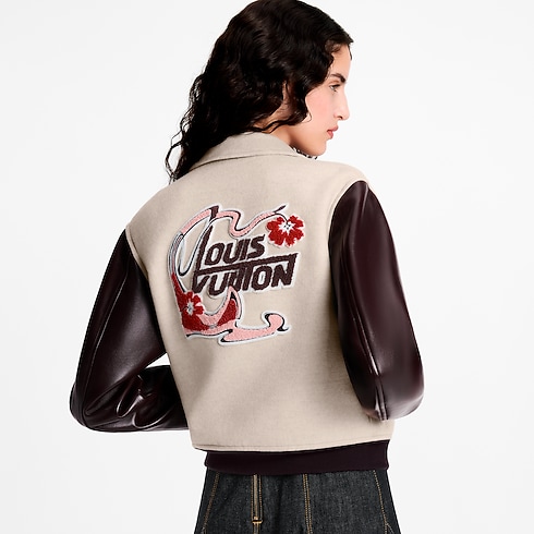 Revisiting a timeless varsity look, this jacket is elevated in a plush double-face wool-silk blend with contrasting sleeves in lambskin leather for a refined finish. The chest and back are embellished with seasonal Louis Vuitton patches that nod to the House’s Art Nouveau heritage, while gold-toned snap buttons and a graphic ribbed waistband underscore the sporty style.