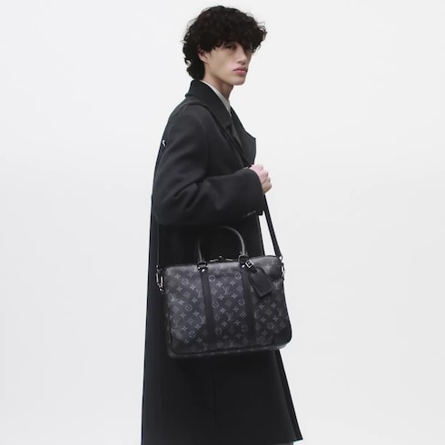 The timeless black-and-gray colorway of Monogram Eclipse canvas perfectly complements the pure lines of this Porte-Documents Voyage PM briefcase. Black-leather top handles, side bands, and reinforced corners structure the bag’s design. A removable and adjustable strap and two top handles give carry options.