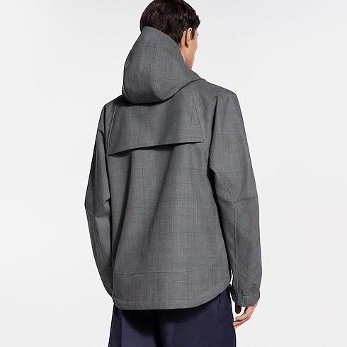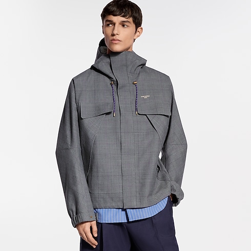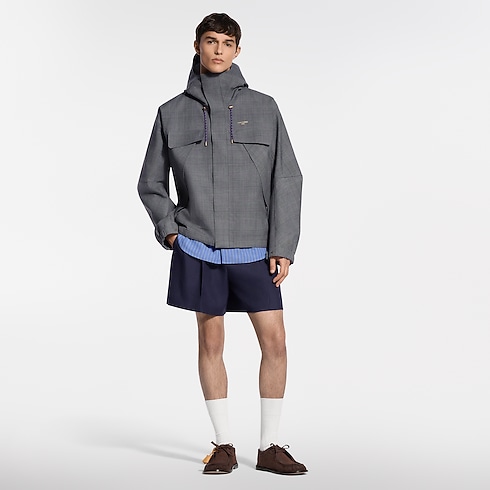 This sporty parka blends the Spring-Summer 2026 show’s Indian Dandy aesthetic with chic mountaineering inspiration. The utilitarian silhouette—featuring flap pockets, vents and an adjustable hood with a technical drawcord—is cut from a fine glen plaid wool in gray and purple tones. A gold-toned printed signature discreetly accents the chest of this elegant and modern piece.