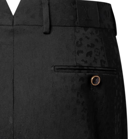 These sleek, black cigarette pants are richly embellished with this collection’s LV Cheetah motif. Interpreted as a rich satin jacquard made from responsibly-sourced wool, the graphic feline pattern integrates discreet Monogram signatures in a rich interplay of matte and lustrous textures. A matching jacket makes a sharp evening suit that stands out from the crowd.