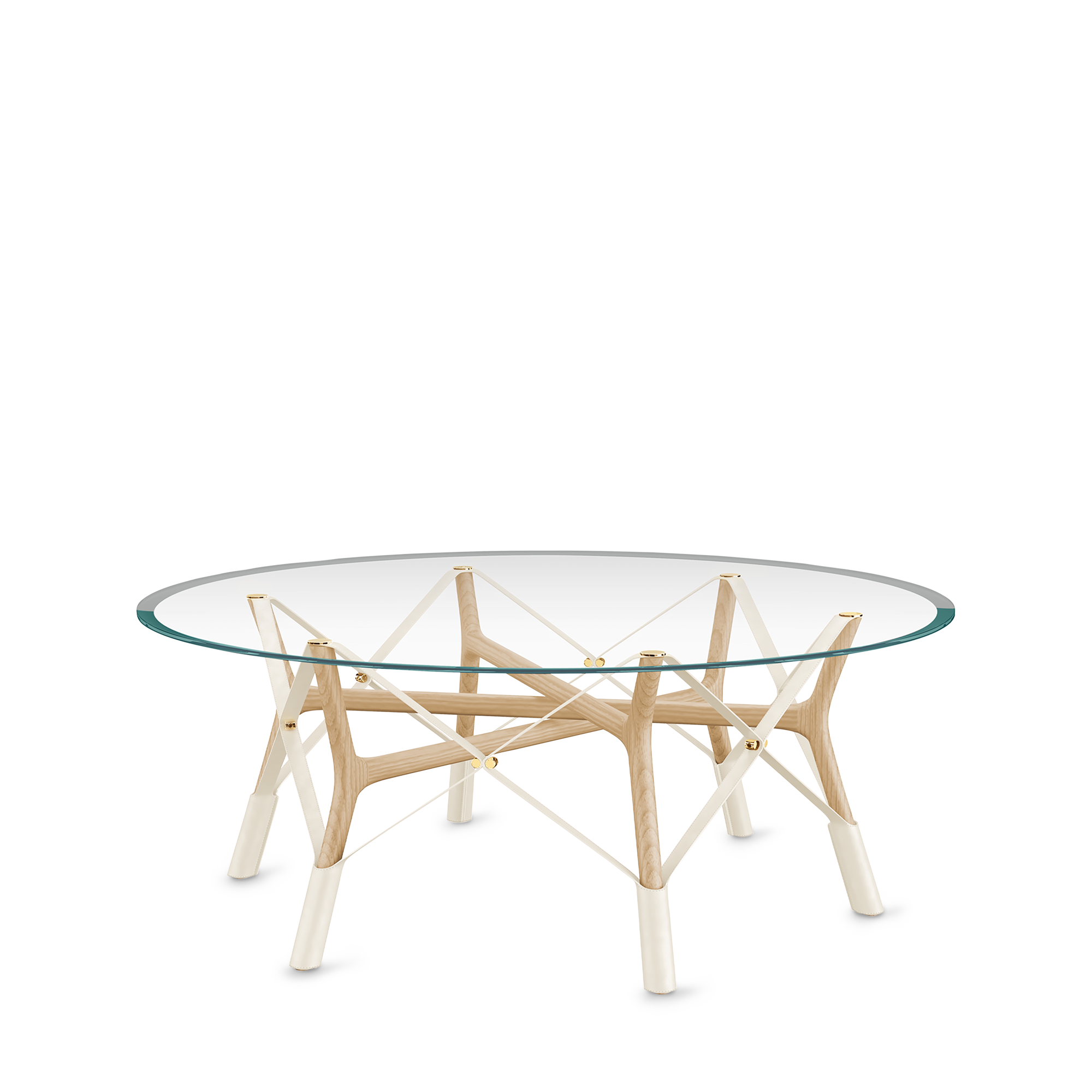 The Serpentine Table is a beautifully conceived and gracefully constructed interplay of weight and tension. Under a bevelled glass top, the table’s criss-crossed smooth wooden legs – foldable for easy storage – are held tight by finely worked straps of leather. The Serpentine is also available as a coffee table.