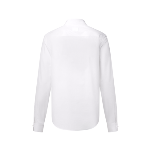 Crafted in a fine cotton-silk blend, this chic white shirt is perfect for completing an evening look. It has a concealed button placket and an elegant rounded collar fastened with a pearly signature brooch. Pearl-like buttons close the cuffs, while a woven signature label adorns the bottom of the placket and a Marque L.Vuitton Déposée label signs the back.