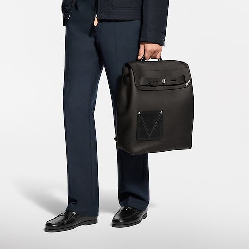 The Steamer Backpack in supple LV Touch calfskin leather blends heritage with modern design. Its grained exterior is accented by a suede front pocket with stitched V detailing. A spacious main compartment includes a padded pocket for a 16-inch laptop, while a drawstring closure and versatile strap enhance everyday functionality.