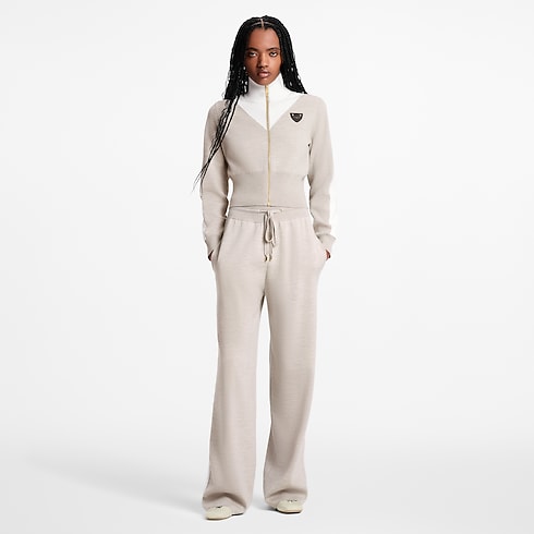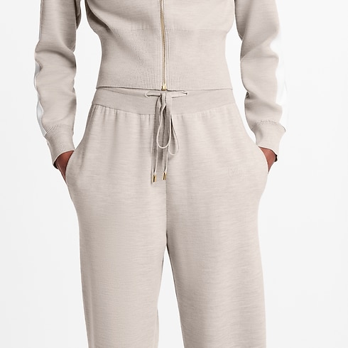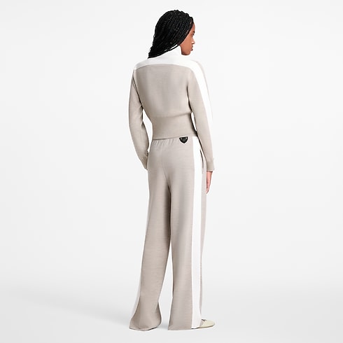 These jogging pants have elevated appeal in a fine wool-blend knit crafted in a wide-leg shape with a flattering wide waistband. The outer seams are highlighted with contrasting stripes for a classic sporty feel, while a leather Louis Vuitton Paris patch adds a refined signature to the back. Complete with two practical side pockets.