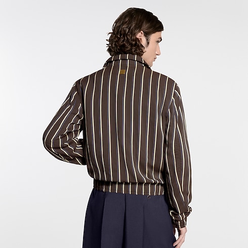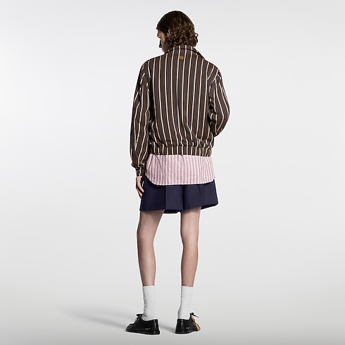 Adopting the effortless elegance of the Spring-Summer 2026 show, this zippered track top merges sartorial codes, bringing together heritage stripes in rich brown tones with a sporty silhouette. Crafted in viscose with a silk-cotton lining and finished with a metal signature ornament on the back, this light and effortless layer elevates everyday looks. Matching shorts make a preppy set.