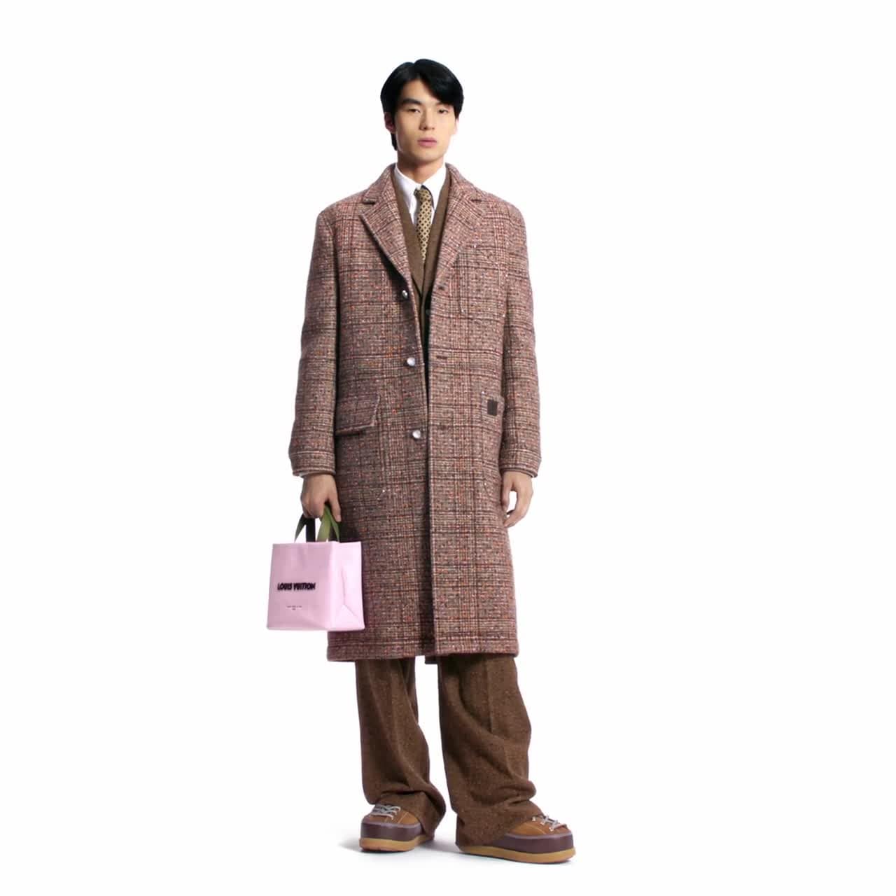 This elegant tailored tweed coat draws on the Fall-Winter 2025 show’s exchange of dandy and streetwear codes. It is crafted from speckled tweed in warm brown tones and adorned with lustrous pearly buttons. Workwear details include riveted patch pockets, while a leather Marque L. Vuitton Déposée patch adds a smart finishing touch.