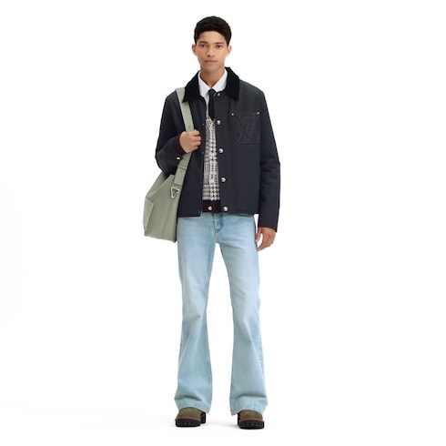 This fashion-forward V-neck cardigan integrates a traditional British tailoring motif into a graphic knit. The cozy brushed wool features a supersized LV Glen Plaid jacquard in cream and brown with pale blue accents. A large blue intarsia LV signs the bottom left, while the dark ribbed cuffs and waist add a smart finishing touch.