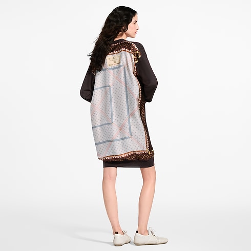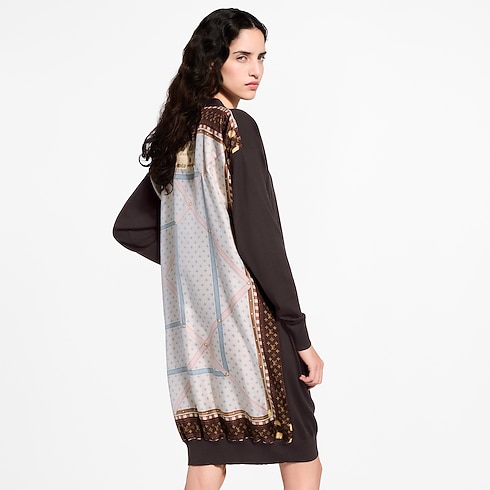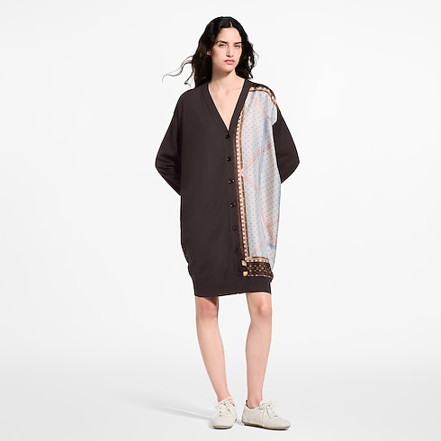 This cardigan subtly celebrates the House’s travel heritage with an elegant silk insert highlighting the left side that features a print of the inside of an archival Louis Vuitton trunk. It is crafted from a cozy wool knit in a long, loose fit that fastens to a V neckline.