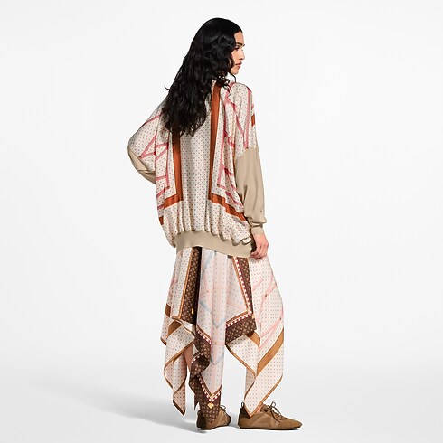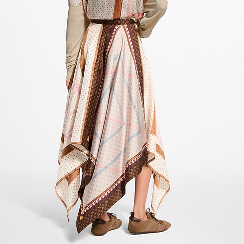 This statement skirt from the runway collection is crafted from soft silk twill in a knee-length shape with a graphic handkerchief hemline for added volume and movement. It is printed with interiors of the House’s archival travel trunks, complete with Monogram borders for an iconic signature finish. Fastened at the back with an invisible zipper.