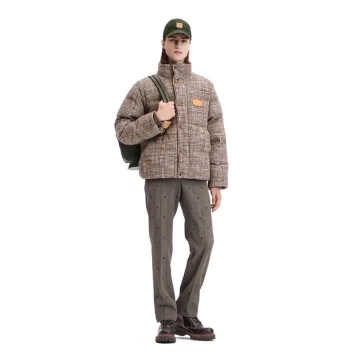 This sophisticated twist on the puffer jacket is made from a refined glen plaid tweed inspired by British sartorial traditions. Perfect for a wintery stroll, it is designed for comfort, with a stand collar, soft ribbed cuffs and a light and warm Ecodown© filling to keep out the cold. Monogram lining adorns the interior, while VVN-colored leather signature patches add a distinguished finishing touch.