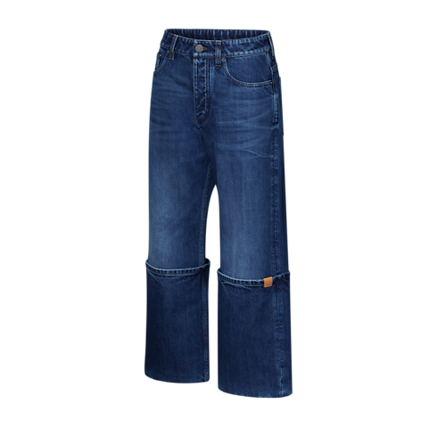 A play of proportion refreshes these staple jeans with a statement twist. They have a classic look in raw denim in a subtle gradient finish accented with contrasting topstitching highlighting the construction. They are cut in a comfortable high-rise straight shape with exaggerated XL cuffs, one of which is discreetly signed with a leather LV Circle tab.