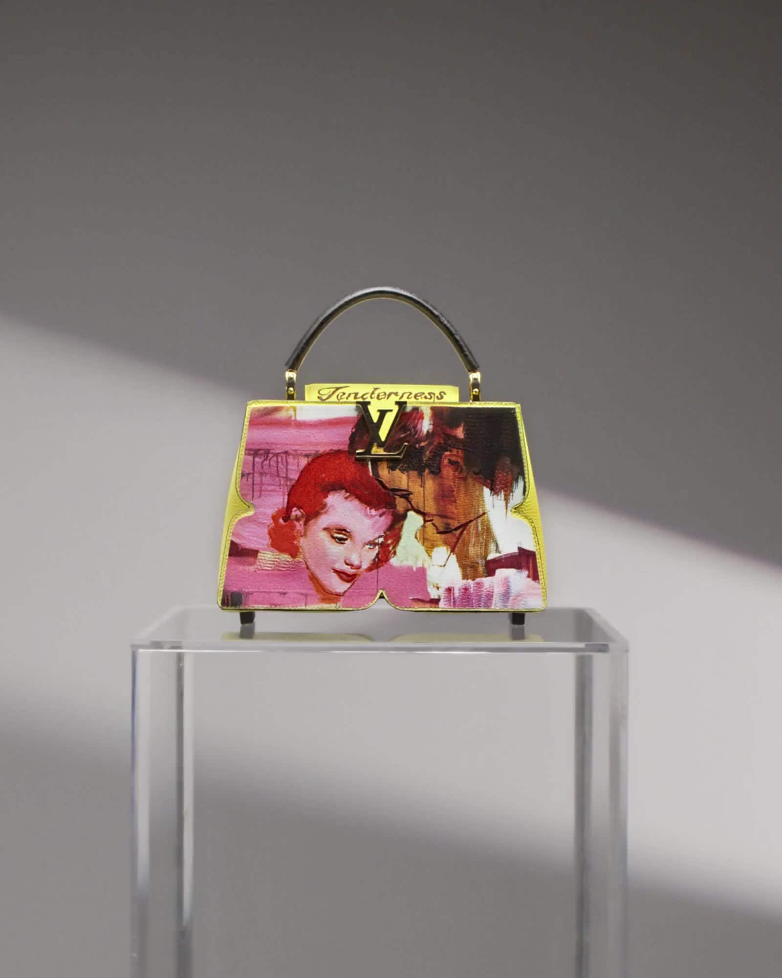 Exemplifying unique savoir-faire, thousands of embroidery stitches reproduce brushstrokes from the artists’ 2021 painting, Tenderness, which are then meticulously printed onto the bag’s front panel in vibrant hues, to accentuate its depth. This process is repeated on the rear panel to transpose a kaleidoscopic palette, in a conceptual representation of perpetually starting over. “That work is from a series of 'sentimental' paintings, which draw on the iconographic source of advertising images from the 1950s.” - Ida Tursic and Wilfried Mille