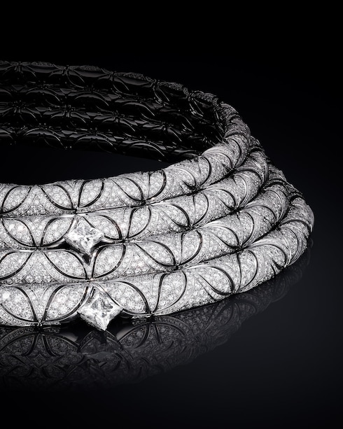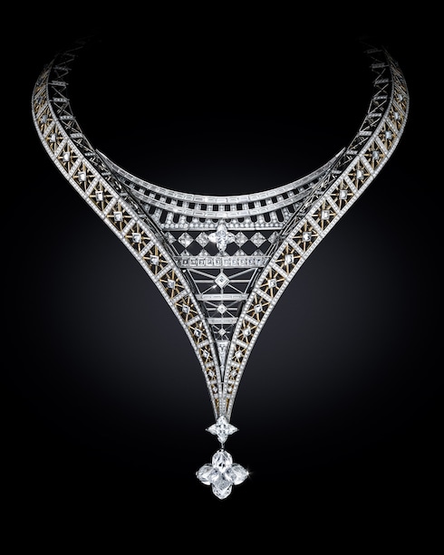 Dynamisme echoes the era’s modern collectivism, evoking the travel phenomenon that propelled Louis Vuitton to the forefront of innovation. A highly structural necklace creates a graphic display of interconnectedness with its precisely aligned links and LV Monogram Star cut diamonds, emphasizing technical mastery through its 3D two-strand chevron motif, while platinum and yellow gold enhance its angular directionality.