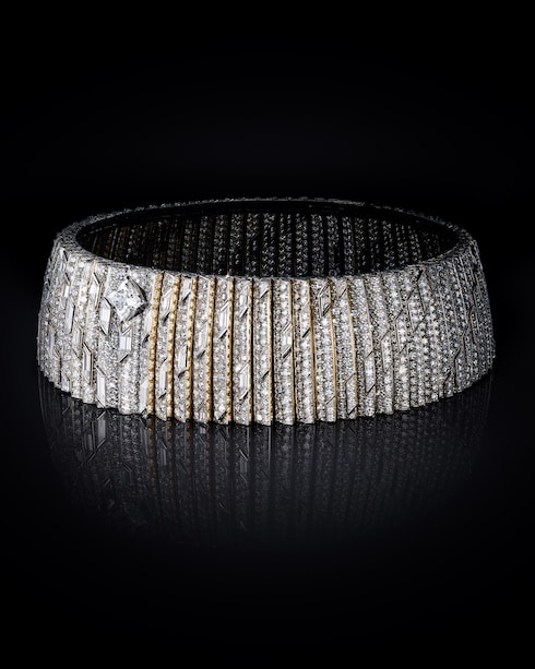 The captivating allure of Paris is personified in Optimisme, unveiled in a play of architectural refinement. Sophisticated and elegant, a bold choker winds around the neck, achieving a fascinating dual tone effect with delicately shaped baguette diamonds among interlocking facades of platinum and yellow gold — a configuration for optimal reflection.