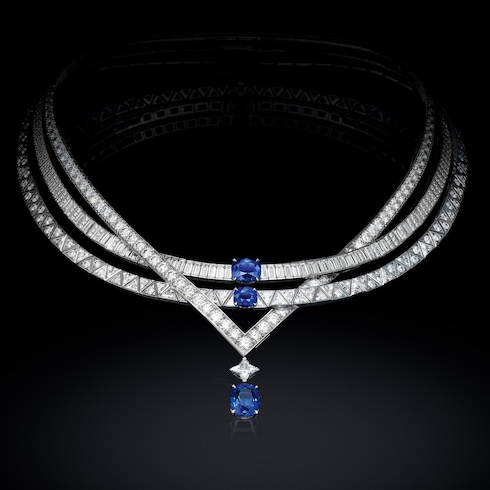 Perception reframes the era's sense of motion and rapid new pace through repeated geometric patterns — realized in mesmerizing mix of diamonds. Unprecedented sapphire gemstones glow with a velvety blue hue, commanding the centerpiece.