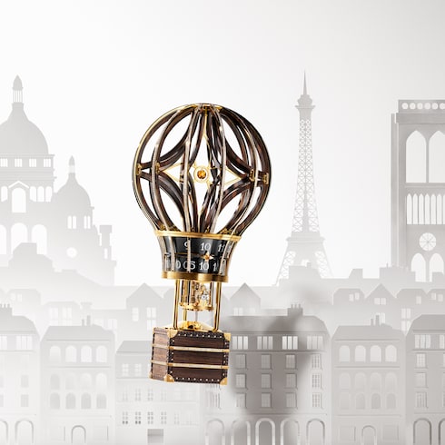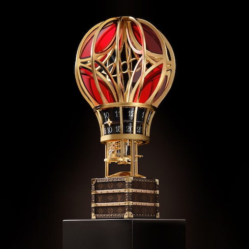 La Montgolfière Aéro traditionnelle, en verre rouge et transparent, est un hommage à l'aéronef ayant inspiré la Maison au fil de ses campagnes et créations. Reposant sur une nacelle constituée de l'une des plus petites malles traditionnelles jamais réalisées par Louis Vuitton, la pièce est parée de l'iconique toile Monogram et des codes emblématiques de la Maison.