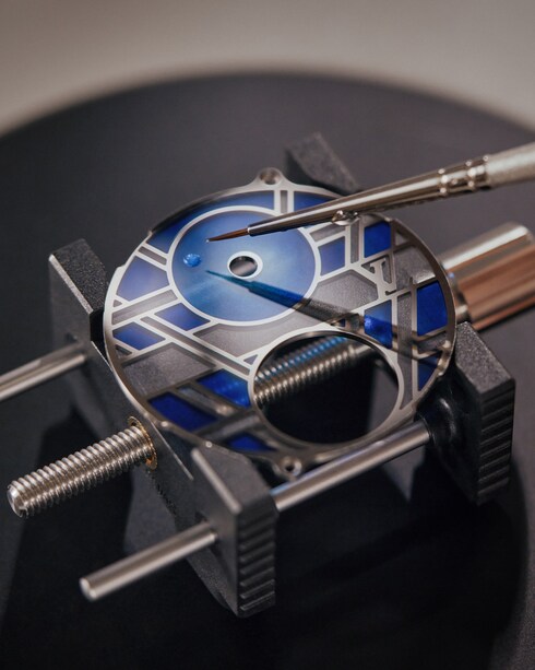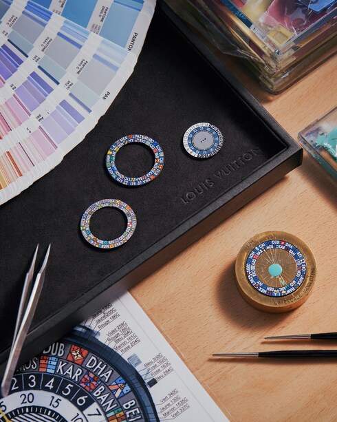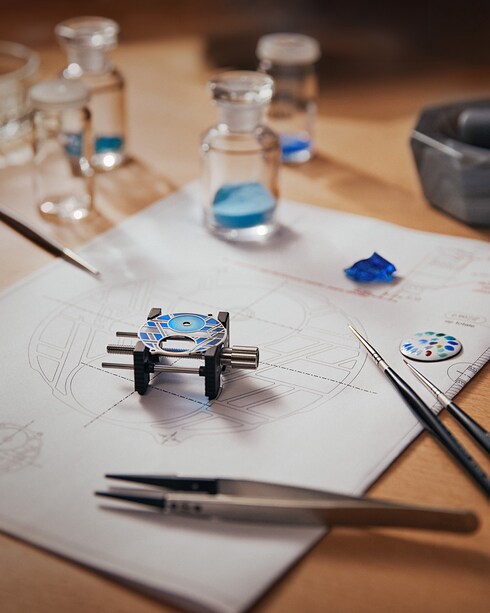 Scellant la rencontre entre les émaux et la chaleur du four pour révéler la brillance et l'intensité des couleurs, l’émaillage est un art exigeant dont les maîtres émailleurs de La Fabrique du Temps Louis Vuitton ont appris les secrets durant de longues années. À l’image du plique-à-jour, aux jeux de transparence et de contrastes mis en scène sur une structure cloisonnée en or, mais aussi du paillonné, qui sublime des couches d’émail de fins paillons de feuilles d’or.