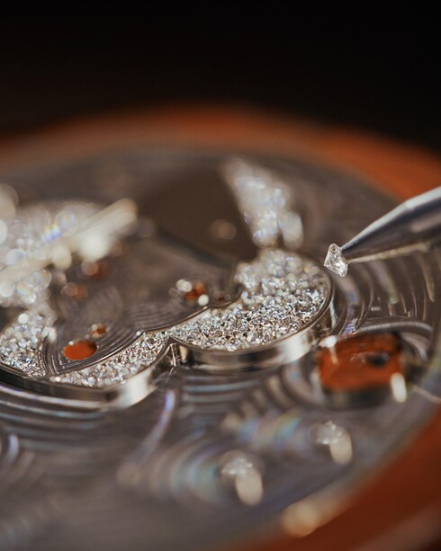 Parant d'un éclat radieux lunettes, boîtiers et cadrans, le sertissage apporte une touche de préciosité aux créations de la manufacture. Le métal est d'abord finement travaillé par le maître joaillier pour accueillir les pierres serties avec un soin et un sens artistique inégalés par le maître sertisseur, selon des méthodes raffinées telles que les sertis clos, griffes ou neige, dont le fini poétique évoque des flocons virevoltant.