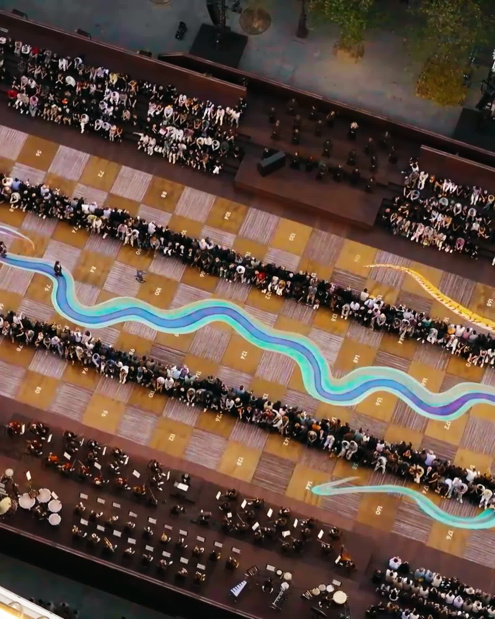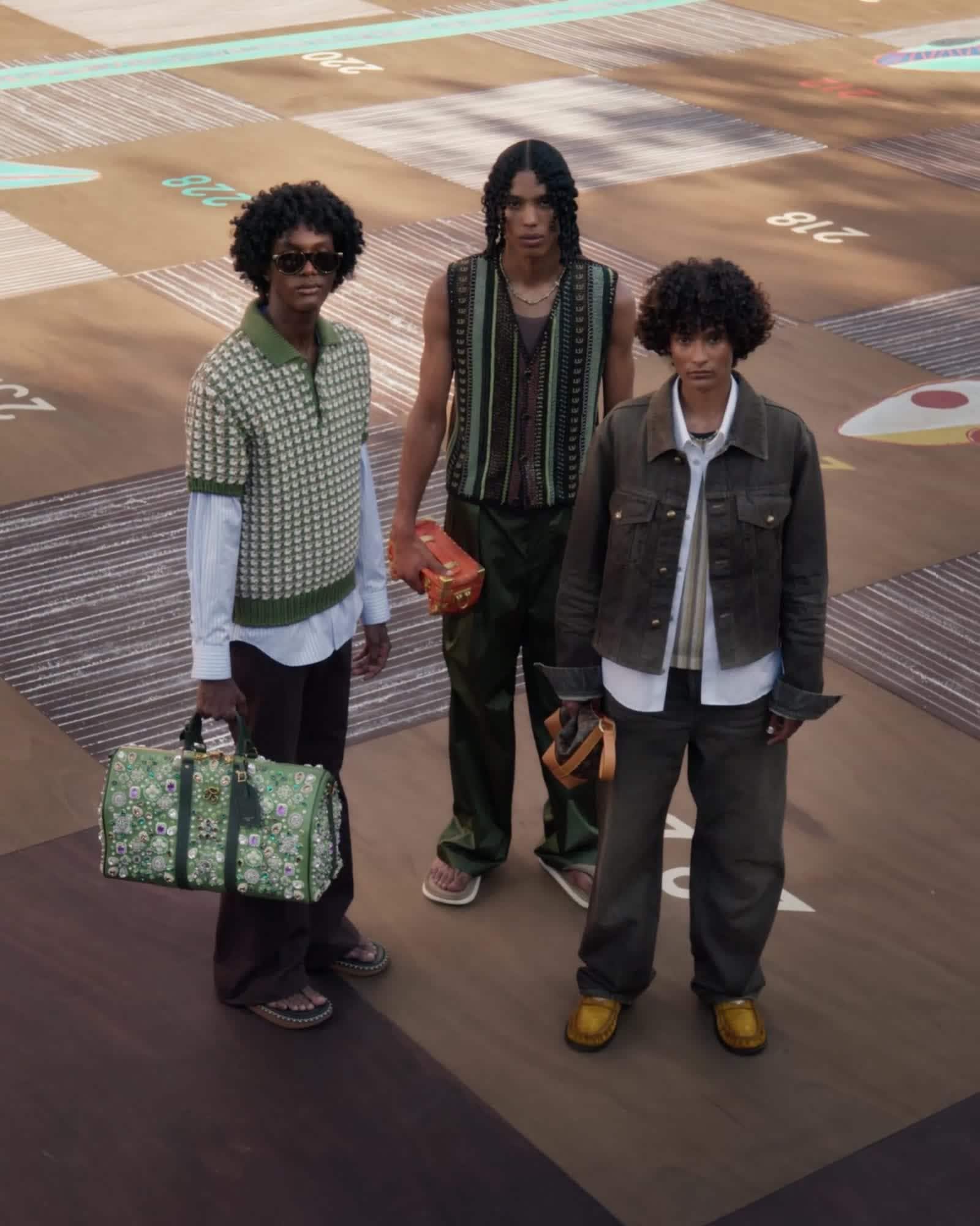 Dans une scénographie en collaboration avec le Studio Mumbai, le jeu traditionnel Snakes and Ladders adopte des dimensions humaines, incorporant l'iconique motif Damier dans un mélange culturel — transformés en joueurs métaphoriques, le public et les modèles évoluent sur un plateau de possibilités.