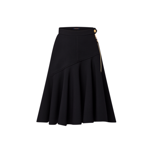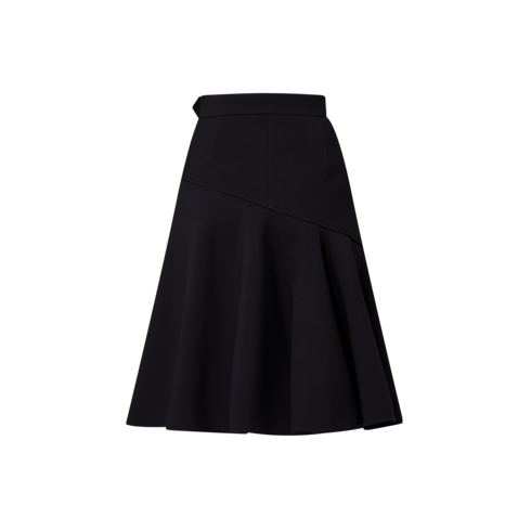 Pensée pour être portée avec tous les looks, cette jupe asymétrique emblématique de la Maison se décline en crêpe de laine raffiné. La silhouette mi-longue intemporelle se rehausse d'une couture diagonale qui sépare la partie supérieure épurée et le bas légèrement évasé. La ceinture s'orne d'un bouton LV doré et le côté présente une fermeture à glissière apparente.